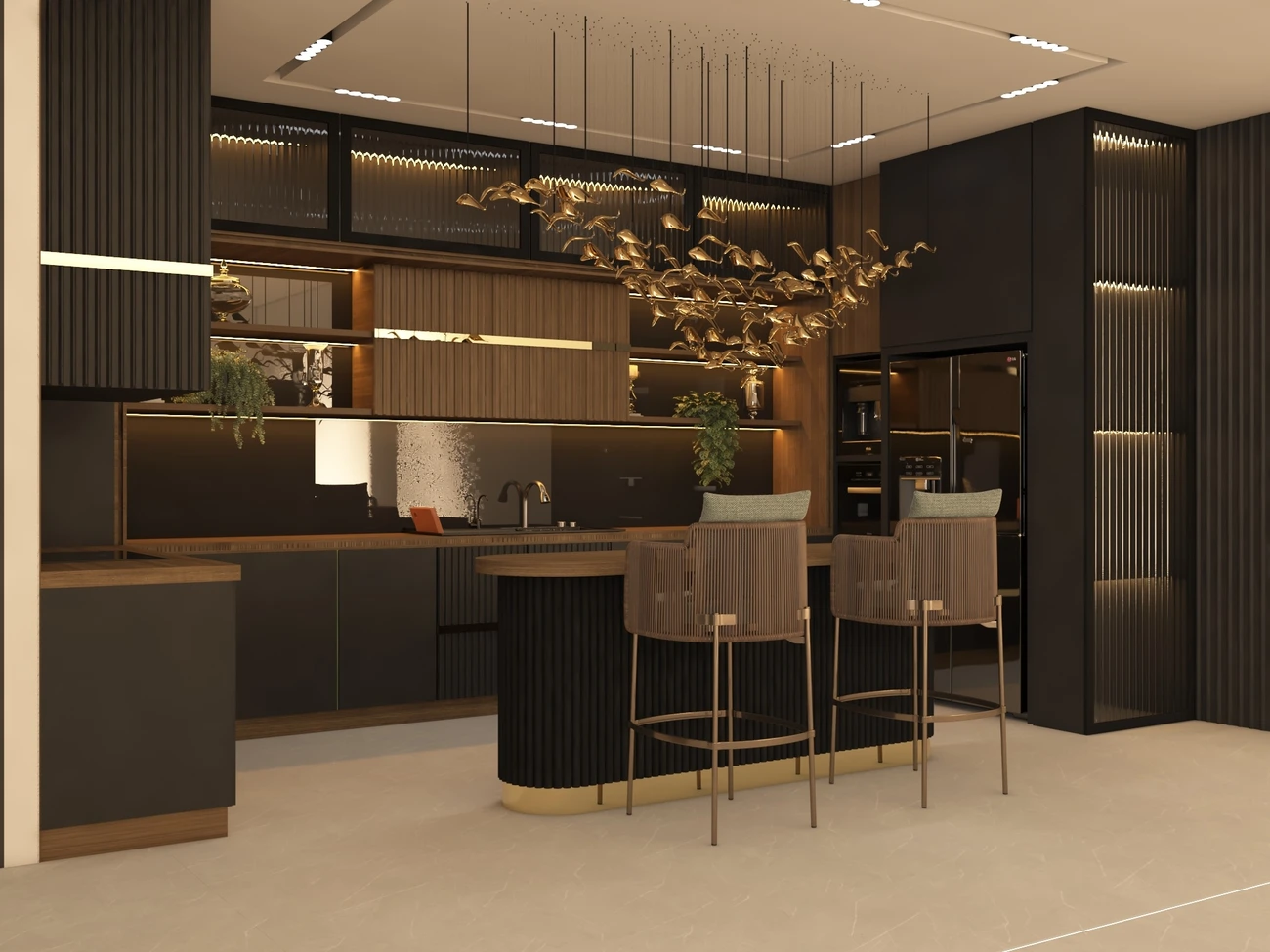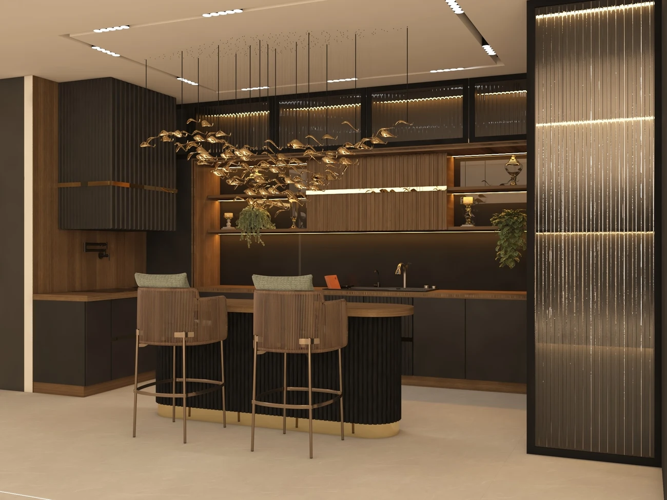 با توجه به عدم نیاز به پخت و پز در طبقه بالا، آشپزخانه این طبقه به یک بار خانگی مدرن تبدیل شد؛ فضایی جذاب و کاربردی برای دورهمی ها که مکمل عملکرد فضاهای خصوصی طبقه بالا است.