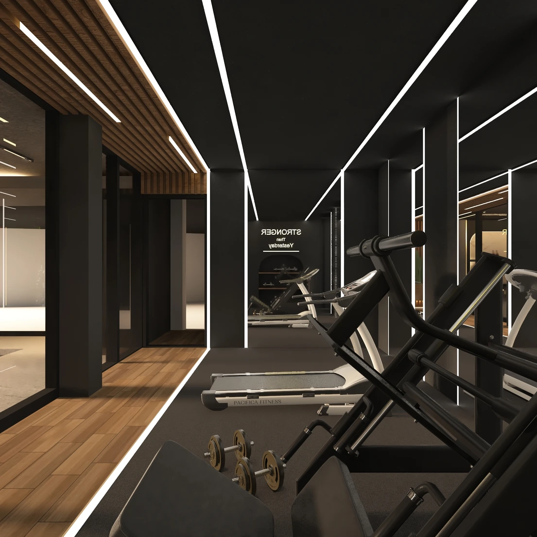 با توجه به اینکه کارفرمای محترم پروژه از مربیان بدنسازی شناخته شده شیراز هستند، طراحی یک هوم جیم در مجاورت فضای استخر از خواسته های اصلی ایشان بود. در این بخش، مرزبندی فضاها با ظرافت و بدون ایجاد گسست بصری انجام شد.