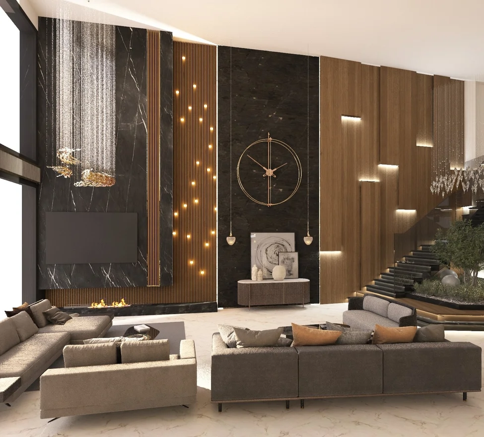 در فضای پذیرایی، یک وید شش متری فرصت مناسبی برای خلق یک المان معماری شاخص فراهم کرد. ترکیب سنگ های اسلب مشکی با اسلت های چوبی و نورپردازی لایه ای، به شکل گیری جداره ای قدرتمند و چشم نواز انجامید.