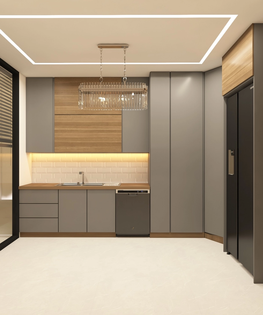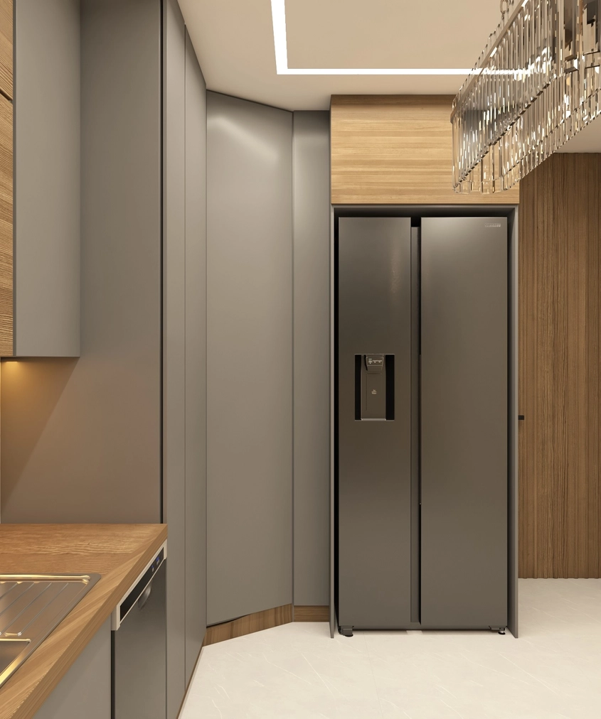 • مطبخ (آشپزخانه گرم) با تم طوسی و متریال های مقاوم طراحی شد تا نظافت آسان تر و عملکرد بهینه تری داشته باشد.