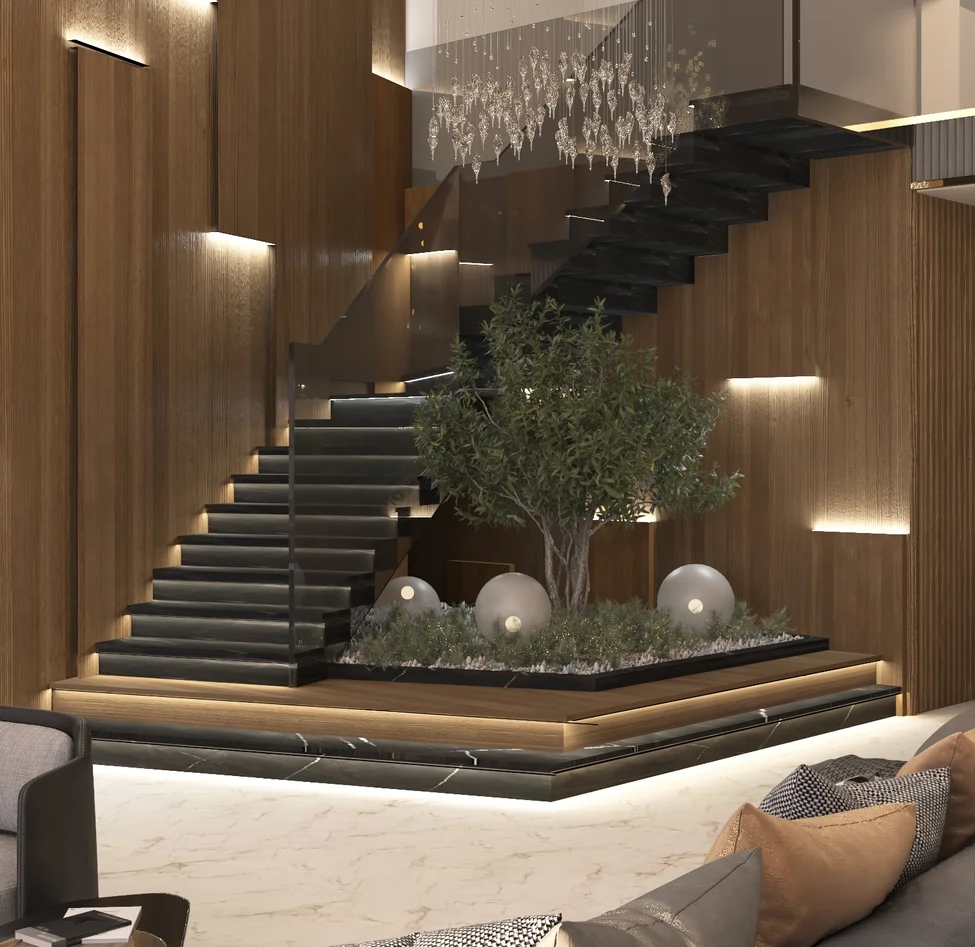 در محل پله دوبلکس، به دلیل عدم دقت اجرایی، انحراف دیوارها به حداکثر خود رسیده بود. این بخش که می توانست به یک ضعف جدی تبدیل شود، با طراحی تخصصی، استفاده از خطوط هدایت کننده، متریال مناسب و نورپردازی هدفمند، به فضایی لاکچری و شاخص در پروژه بدل شد.