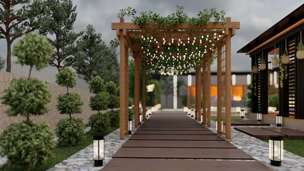 در مسیر محوطه، پرگولایی با گیاهان رونده و نورهای ریسه ای طراحی شده که حرکت ساکنان و مهمانان را از مقابل ورودی ویلا هدایت می کند و مسیر را قابل تشخیص و جذاب می سازد. تکرار این المان در بخش دیگری از محوطه، علاوه بر ایجاد سایه و مشخص کردن مسیر، باعث شده حرکت در فضا ریتمی منظم پیدا کند و تجربه حضور در محوطه برای همه دلنشین و هماهنگ با طراحی کلی ویلا شود. این طراحی ساده اما دقیق، باعث شده افراد در هنگام حرکت در محوطه، احساس راحتی و انسجام بیشتری داشته باشند و مسیرها به طور طبیعی خوانا و قابل دنبال کردن باشند.